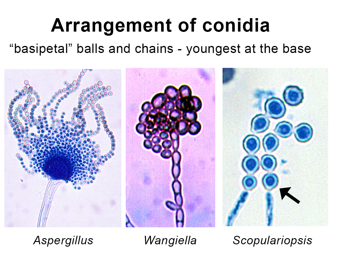 - Basipetal - catenulate where the oldest conidium is at the apex and the youngest is at the base.