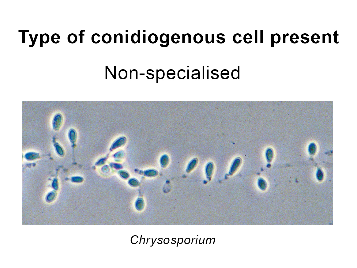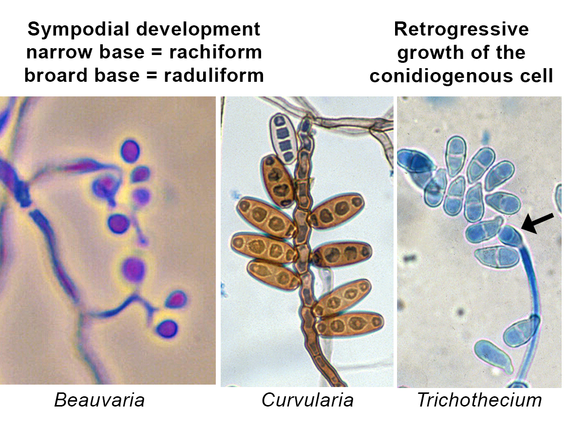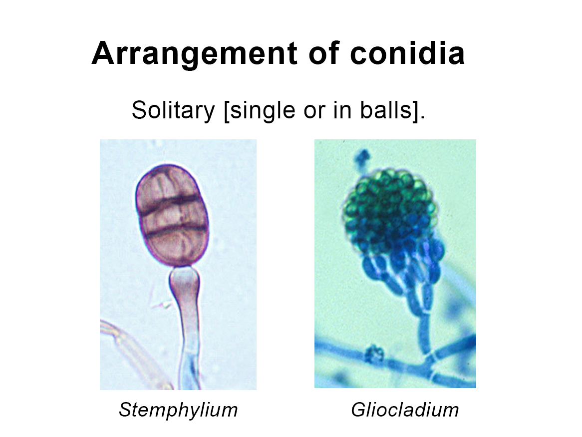 Identification of the hyphomycetes is primarily based on microscopic morphology including; (a) conidial morphology, especially septation, shape, size, color and cell wall texture; (b) the arrangement of conidia as they are borne on the conidiogenous cells, for example are they solitary, arthrocatenate, blastocatenate, basocatenate or gloiosporae etc., (c) the type conidiogenous cell, for example non-specialized or hypha-like, phialide, annellide or sympodial etc., and (d) other additional features such as the presence of sporodochia or synnemata.