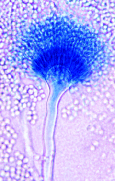 Colonies are usually fast growing, white, yellow, yellow-brown, brown to black or shades of green, mostly consisting of a dense felt of erect conidiophores. Conidiophores terminate in a vesicle covered with either a single palisade-like layer of phialides (uniseriate) or a layer of subtending cells (metulae) which bear small whorls of phialides (the biseriate structure). The vesicle, phialides, metulae (if present) and conidia form the conidial head. Conidia are one-celled, smooth or rough-walled, hyaline or pigmented, are produced in long dry chains which may be divergent (radiate) or aggregated in compact columns (columnar). Some species may produce Hülle cells or sclerotia.For morphological identification, isolates are usually inoculated at three points on Czapek Dox agar and 2% malt extract agar and incubated at 25C. Most species sporulate within 7 days. Descriptions are primarily based on colony pigmentation and morphology of the conidial head. Microscopic mounts are best made using cellotape flag or slide culture preparations mounted in lactophenol cotton blue. A drop of alcohol is usually needed to remove bubbles and excess conidia.