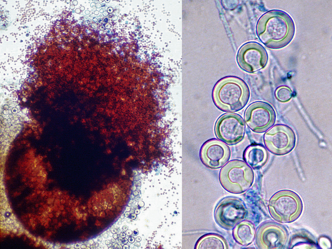 Hyaline hyphomycete showing distinctive conidial heads with flask-shaped phialides arranged in whorls on a vesicle.References: