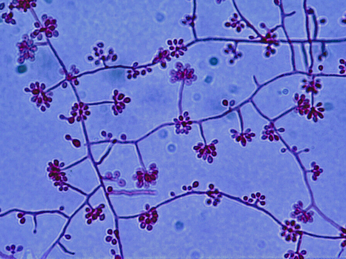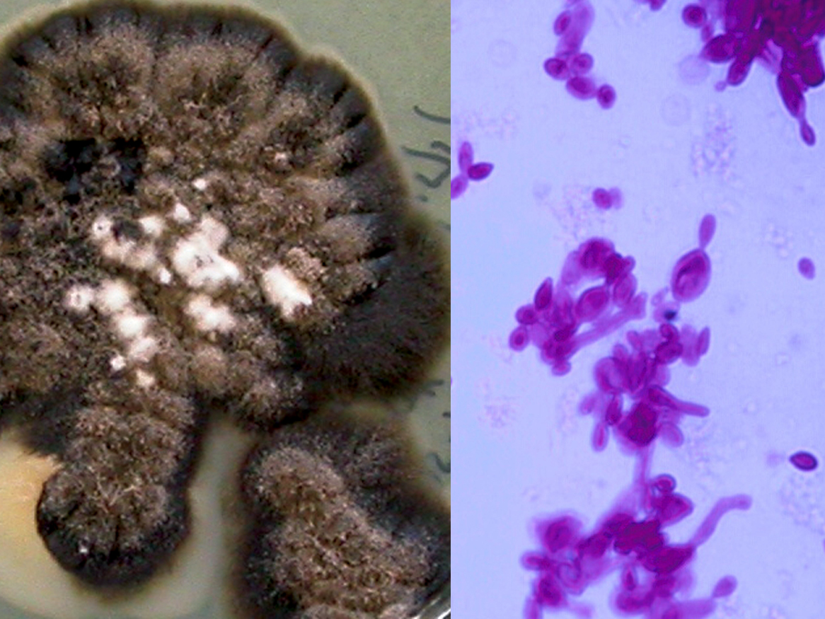 Colonies at 25C, are slow growing, moist and glabrous, with a wrinkled and folded surface. Some strains may produce short aerial hyphae and pigmentation may vary from white to cream to black. Conidiophores arise at right angles from thin septate hyphae and are usually solitary, erect and tapered toward the apex. Conidia are formed in clusters on tiny denticles by sympodial proliferation at the apex of the conidiophore, their arrangement often suggestive of a flower. As the culture ages, conidia are subsequently formed singly along the sides of both conidiophores and undifferentiated hyphae. Conidia are ovoid or elongated, 3-6 x 2-3 µm, hyaline, one-celled and smooth-walled. In some isolates, solitary, darkly-pigmented, thick-walled, one-celled, obovate to angular conidia may be observed along the hyphae. On brain heart infusion (BHI) agar containing blood at 37C, colonies are glabrous, white to greyish-yellow and yeast-like consisting of spherical or oval budding yeast cells.